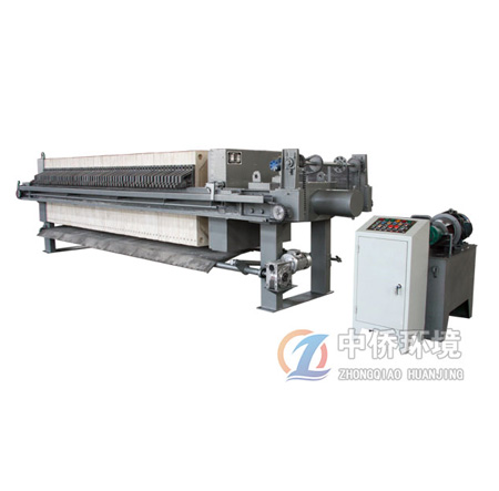 手動搬動絲杠手輪,使頭板前進(jìn),待濾板初步壓緊后改為液壓頂緊。用泵將帶過濾的懸浮液輸送到已壓緊的各個濾室中,懸浮液中的液體透過濾布,通過各濾板上的濾孔排至機(jī)外,懸浮液中固體顆粒則積聚于濾室中,并逐漸形成濾餅,濾餅充滿濾室即完成一個過濾循環(huán),過濾完成后則松開濾板,拉板卸料。